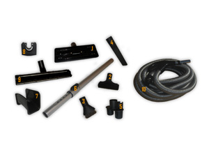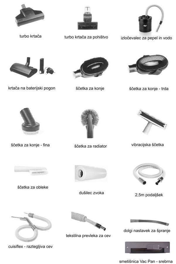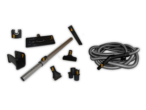 Sesalni pribor standard Vsebuje: 1. krtača - kombinirana 2. - 5. komplet drobnih nastavkov 6. teleskopska cev - kromirana 7. nosilec gibljive cevi 8. nosilec teleskopske cevi 9. sesalna cev - standard 9m |